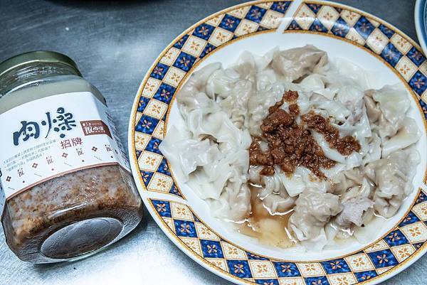 這樣裡頭的肉質比較不會變硬或是讓整罐肉燥變鹹,攪拌均勻後淋在餛飩上,
